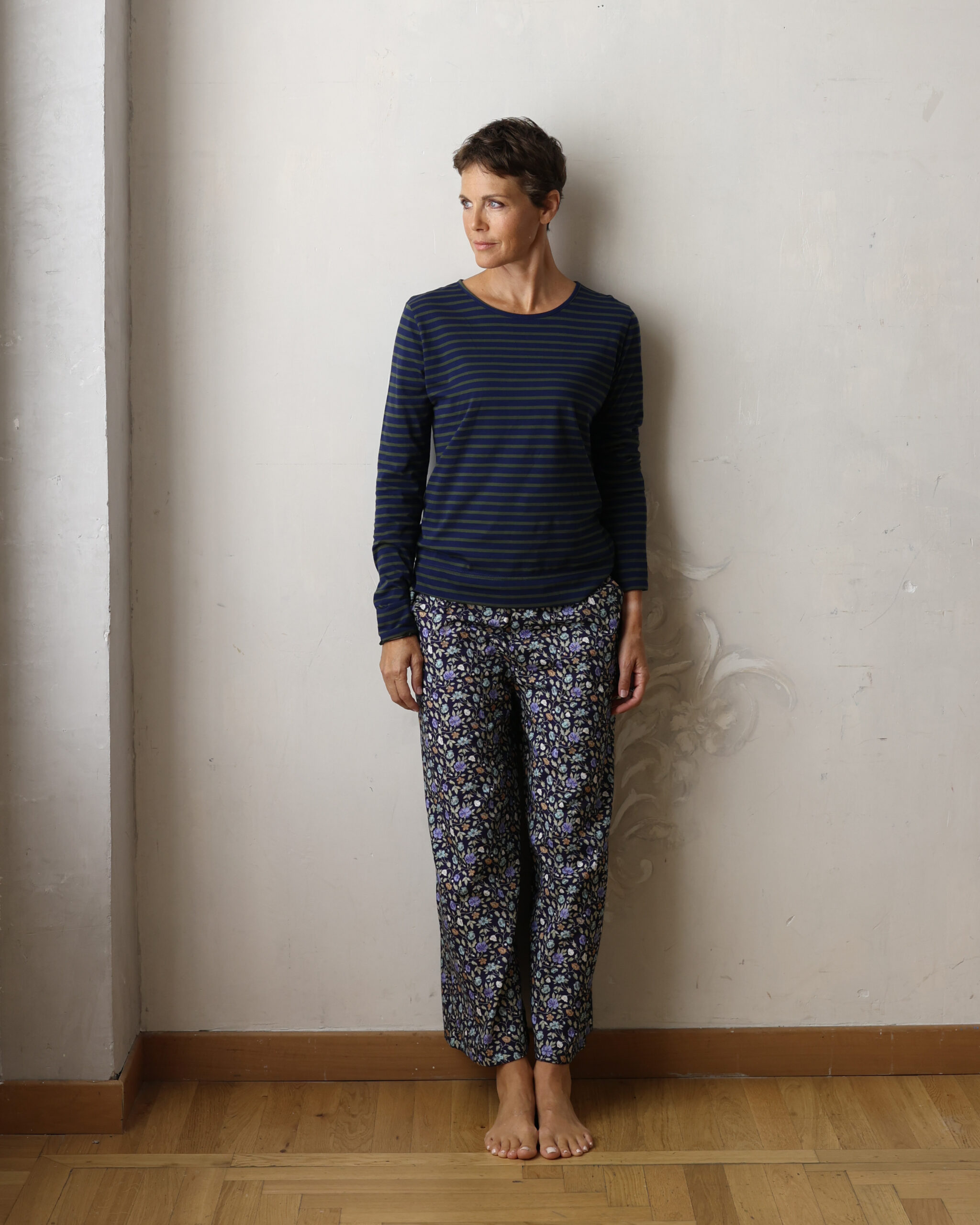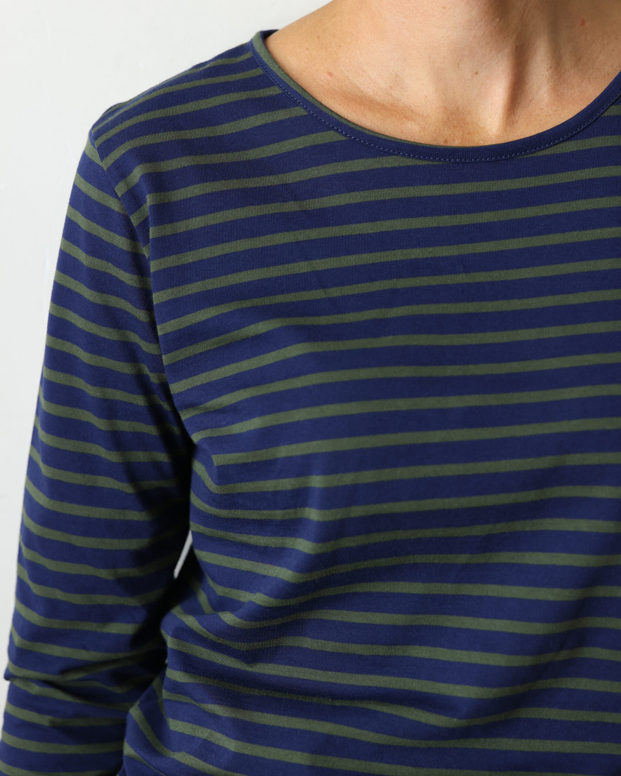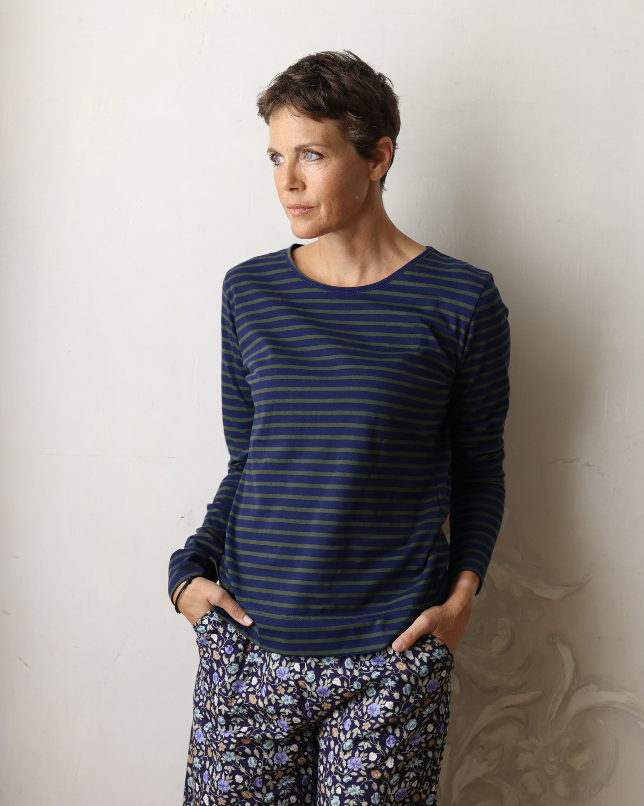 Maglietta a maniche lunghe, perfetta anche da utilizzare sotto a giacche o maglioni. Spacchetti laterali. Jersey morbido di cotone con una piccola percentuale di elastane. Una nota sulle righe: sono volutamente non appaiate. Questo perché renderle perfettamente simmetriche significherebbe un grande spreco di tessuto e una manodopera maggiore cha farebbe notevolmente aumentare il costo finale