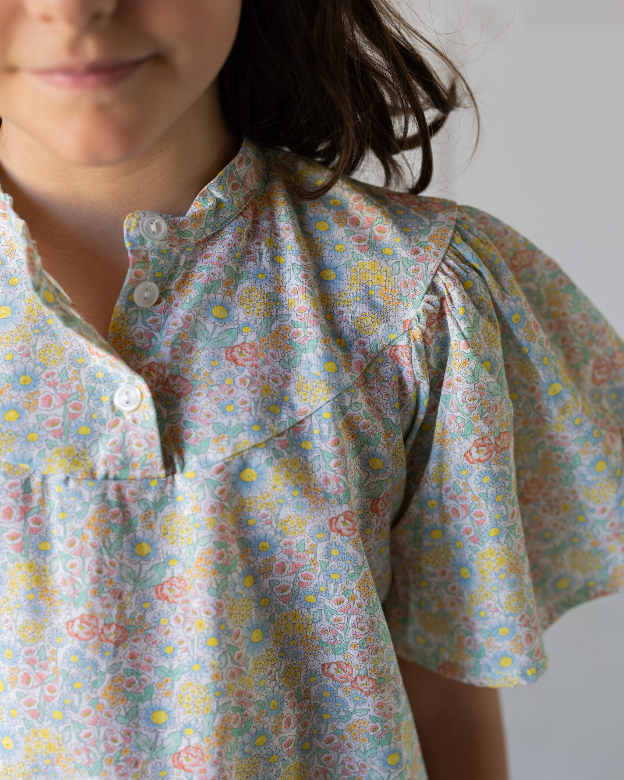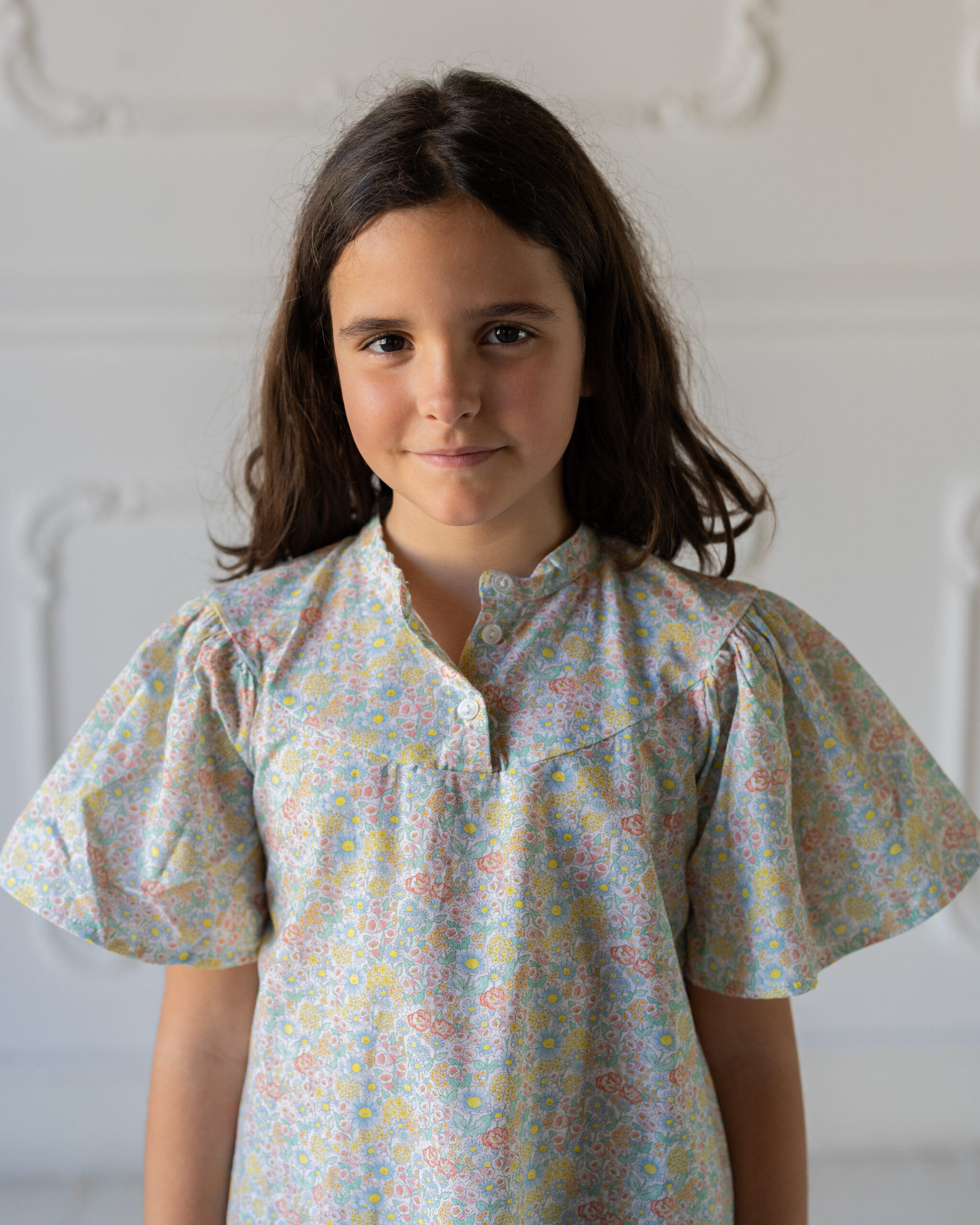 Camicetta bambina con maniche tulipano, forma a trapezio e bottoncini color legno.