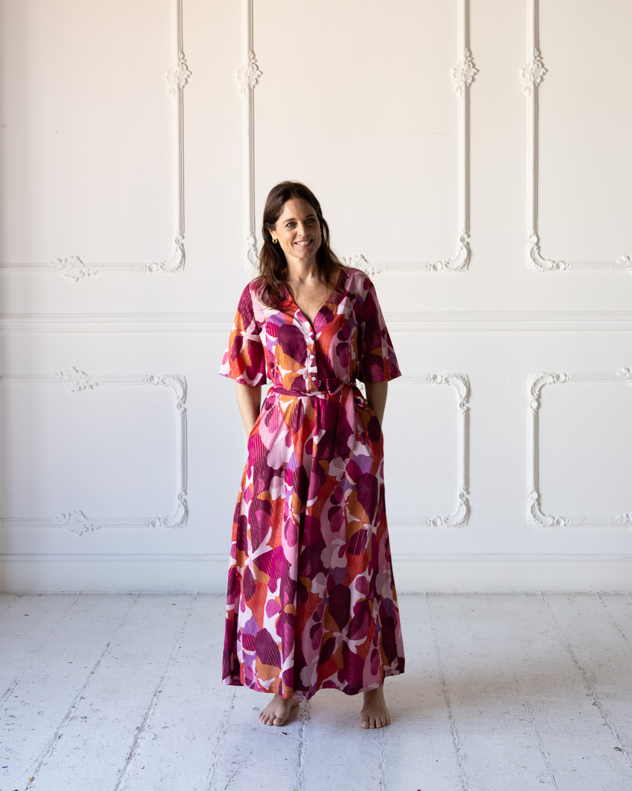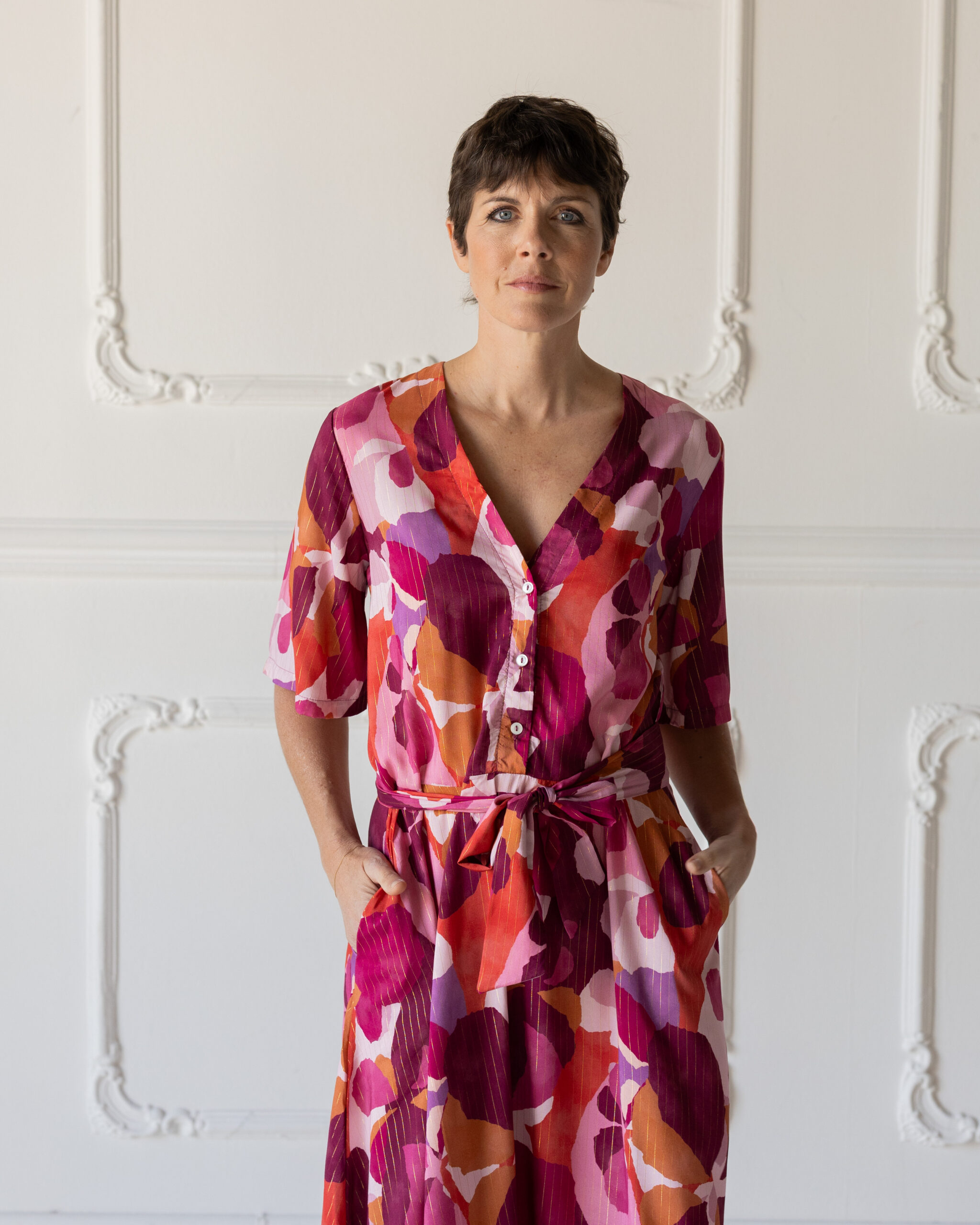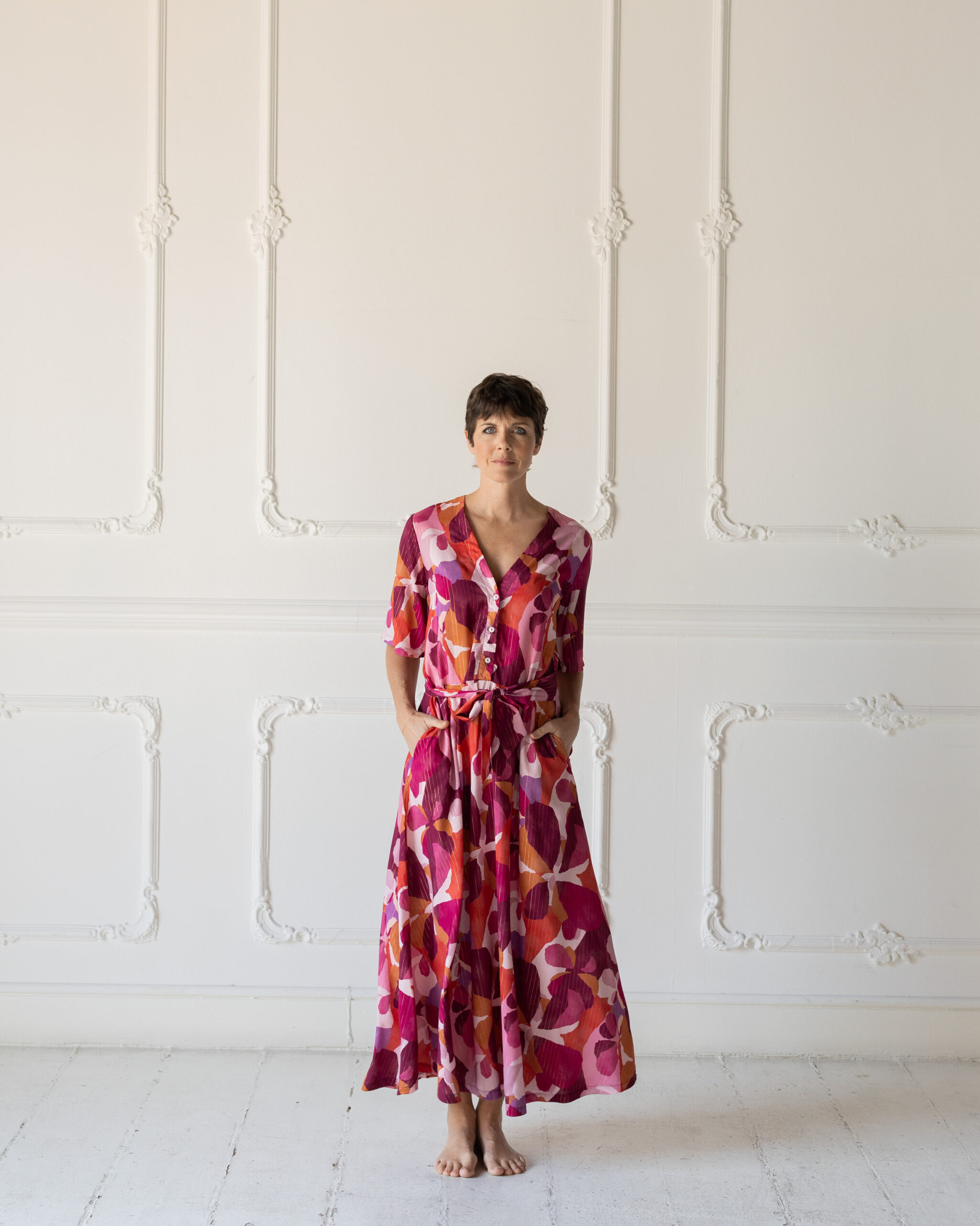 Abito versatile, realizzato in viscosa così che cada morbido e fluido. Da portare con la fusciacca abbinata o con una cintura a piacere, ma anche lasciato libero.