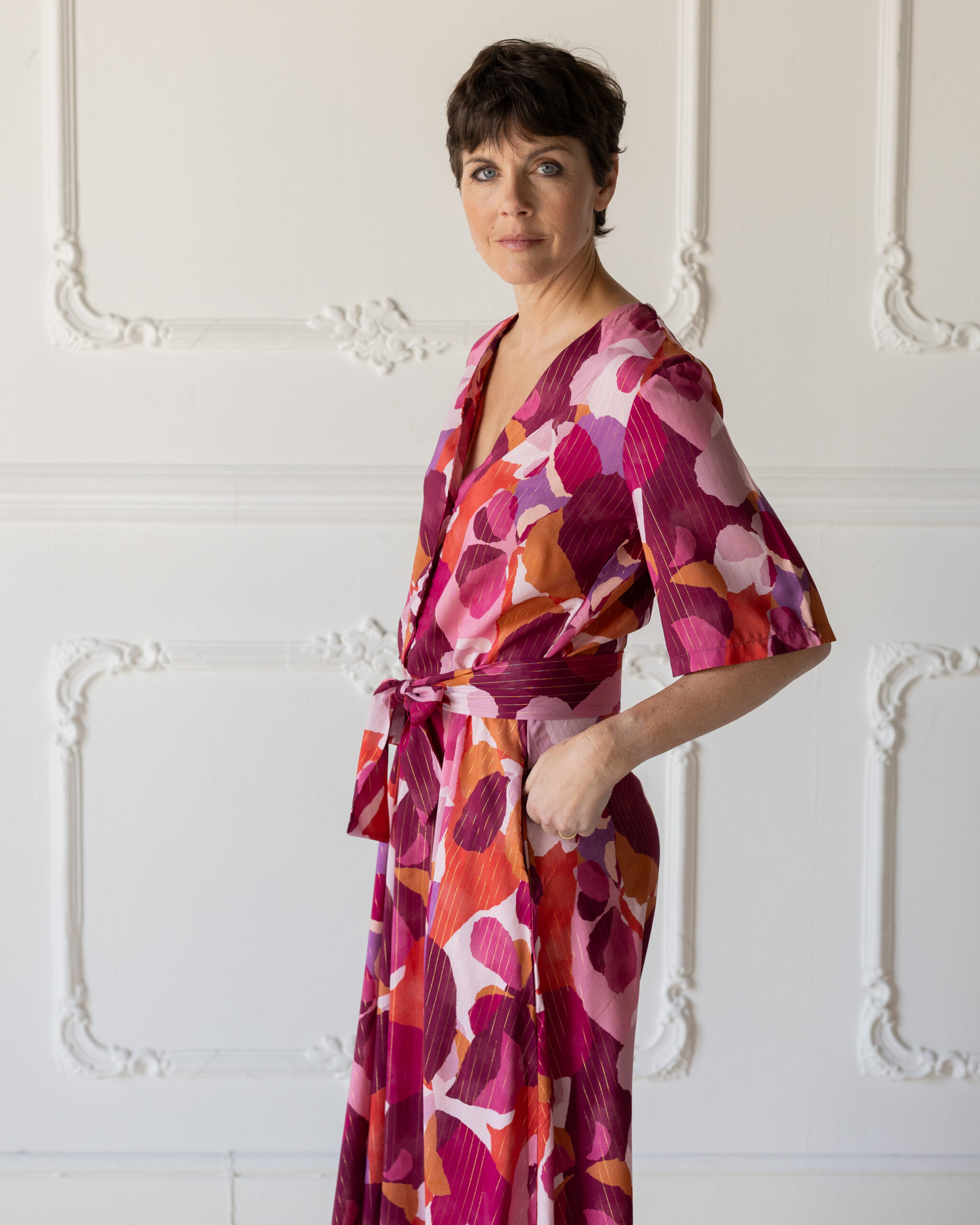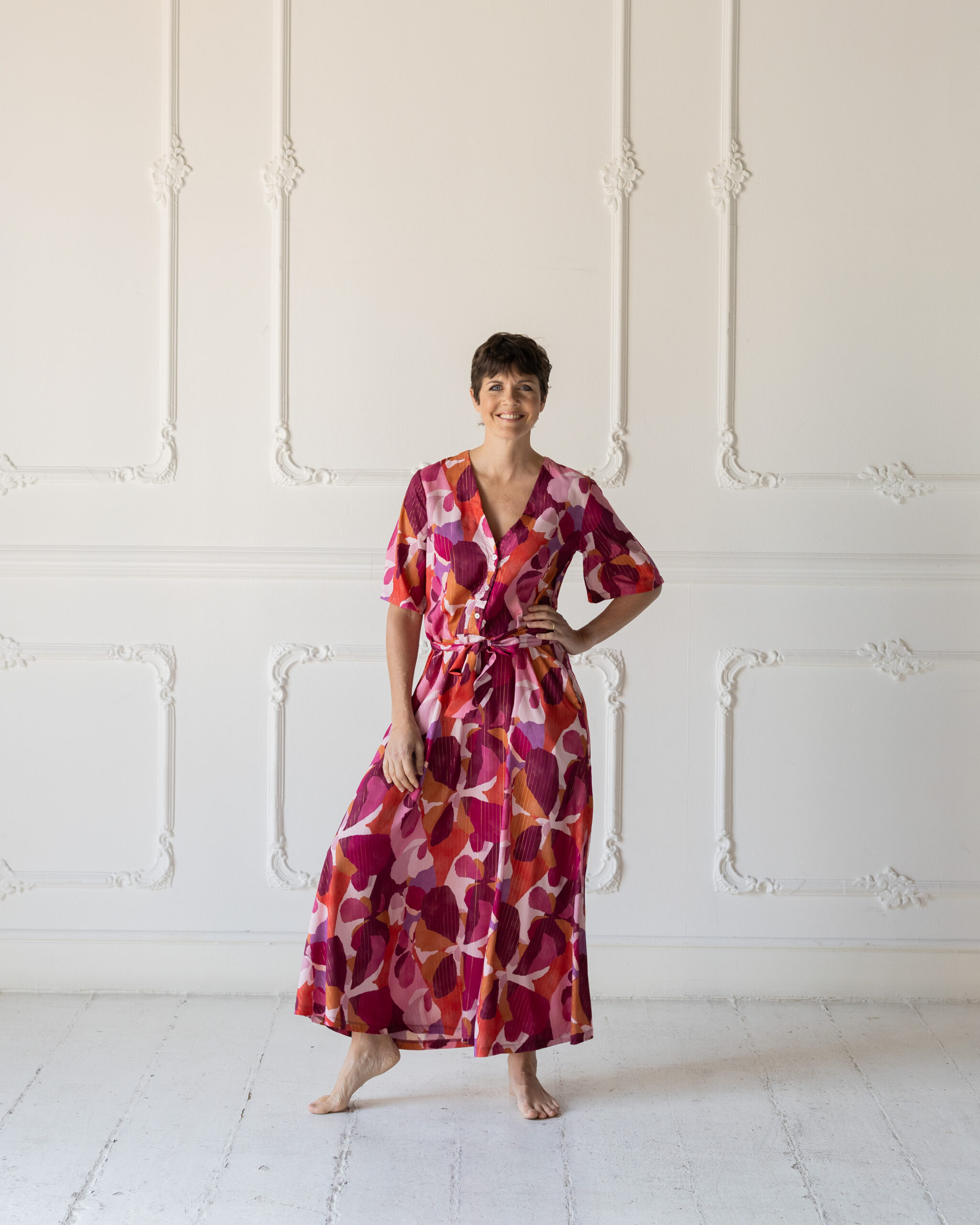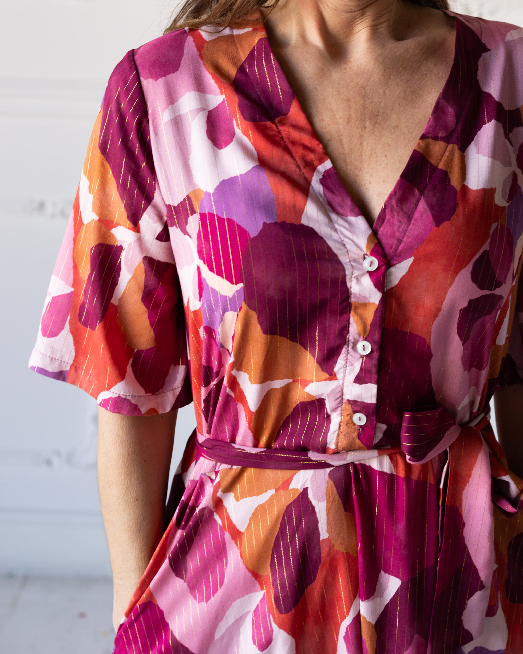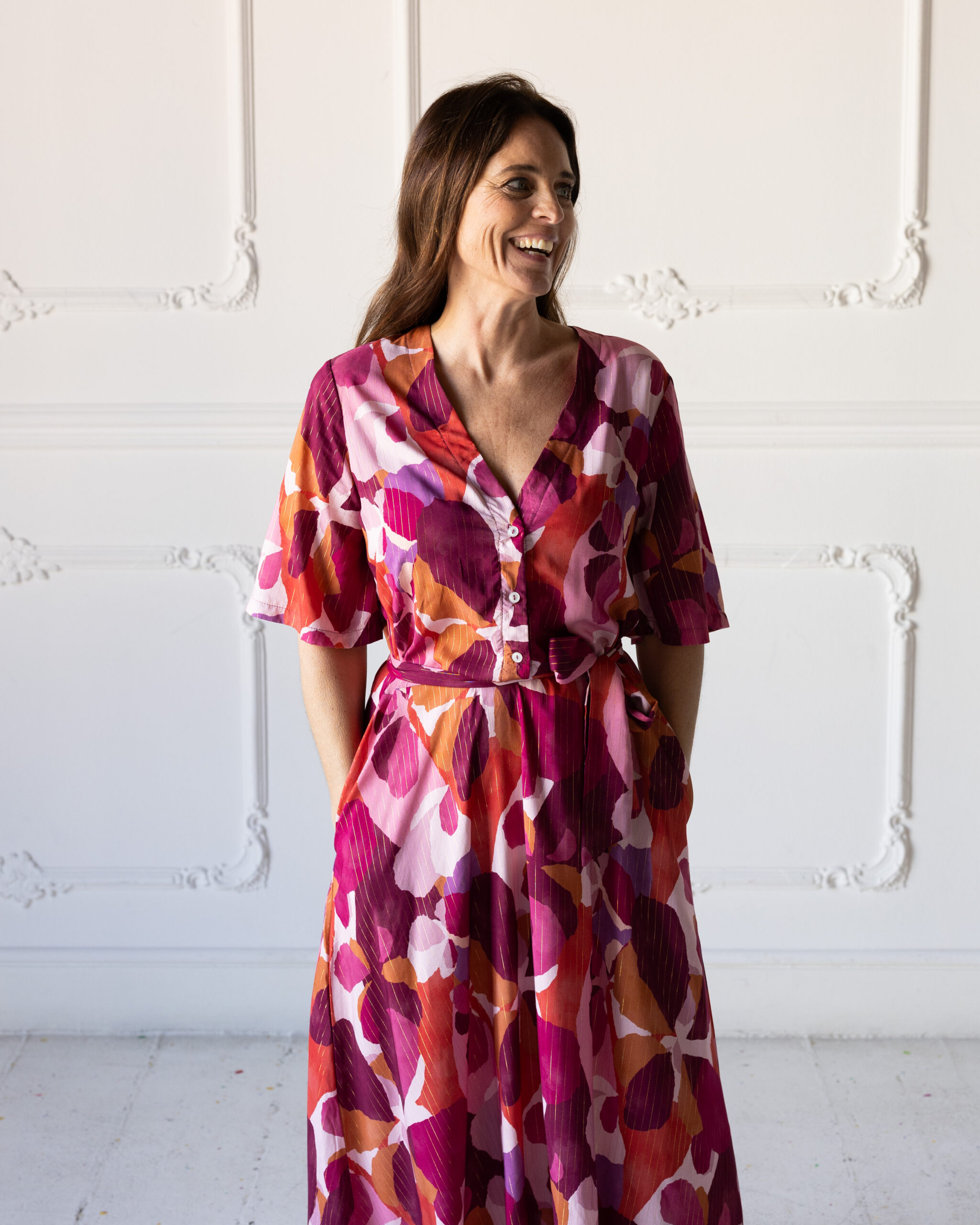 Abito versatile, realizzato in viscosa così che cada morbido e fluido. Da portare con la fusciacca abbinata o con una cintura a piacere, ma anche lasciato libero.