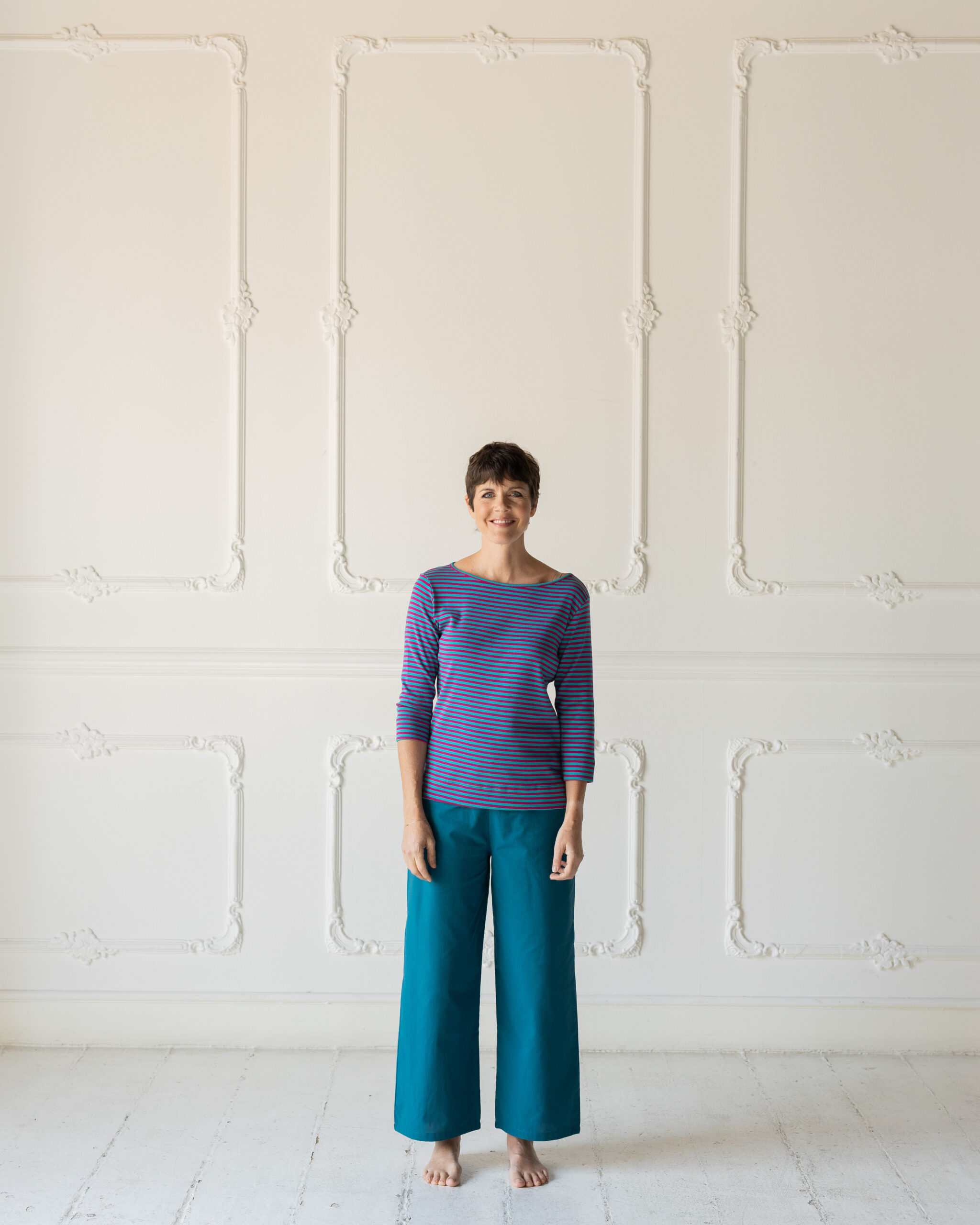 Una morbida maglietta in jersey di cotone o lino rigato , scollo a barchetta e manica tre quarti! Osate accostamenti particolari perché le righe stanno bene su tutto