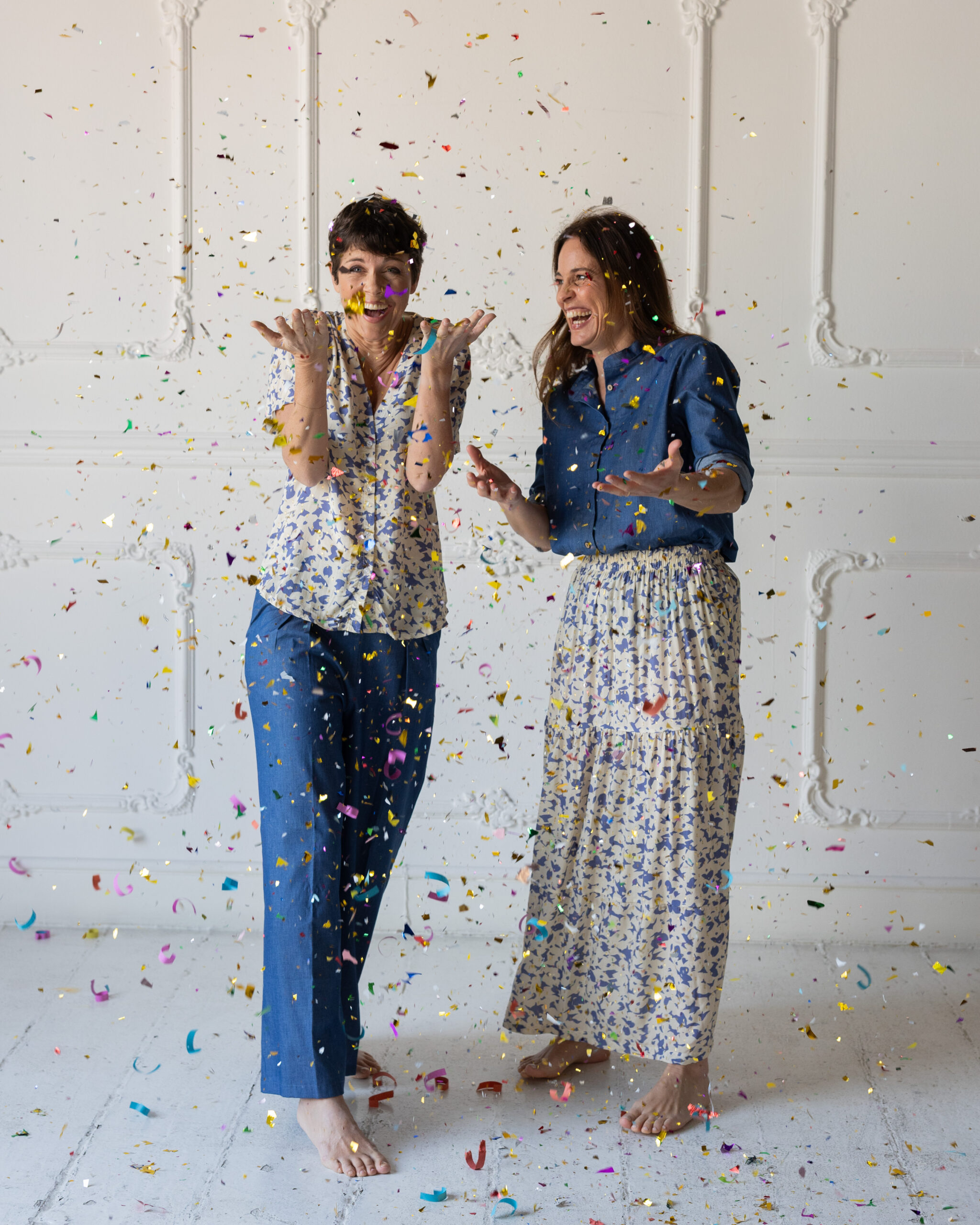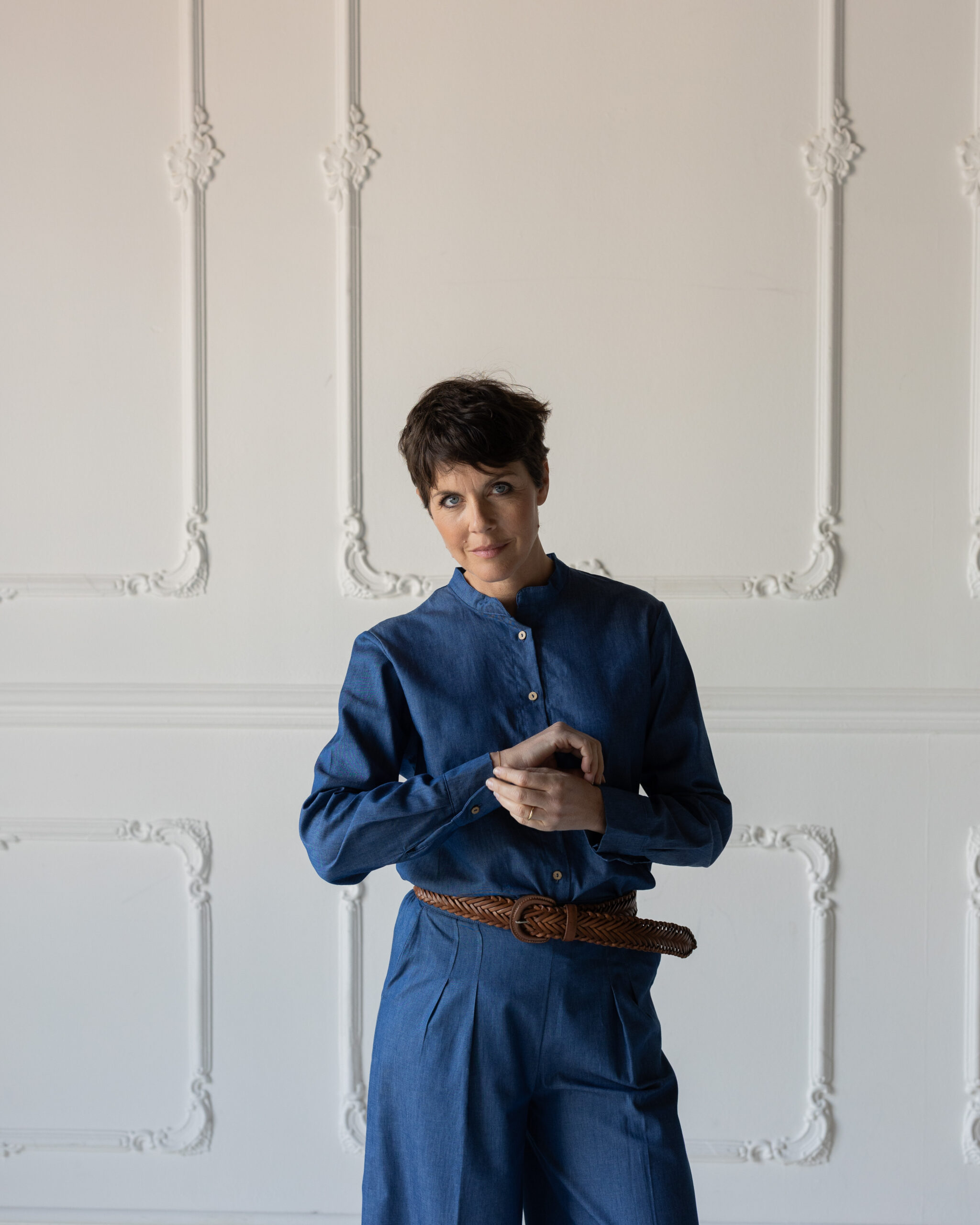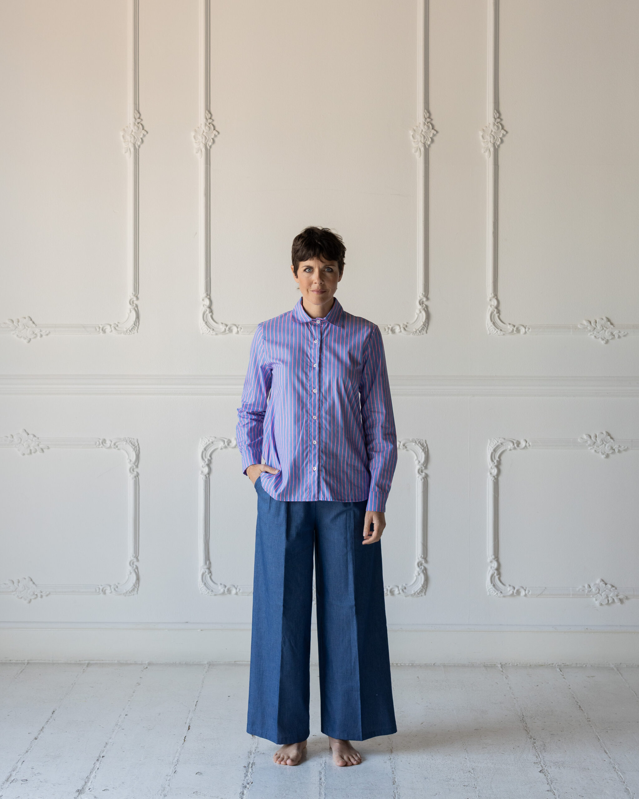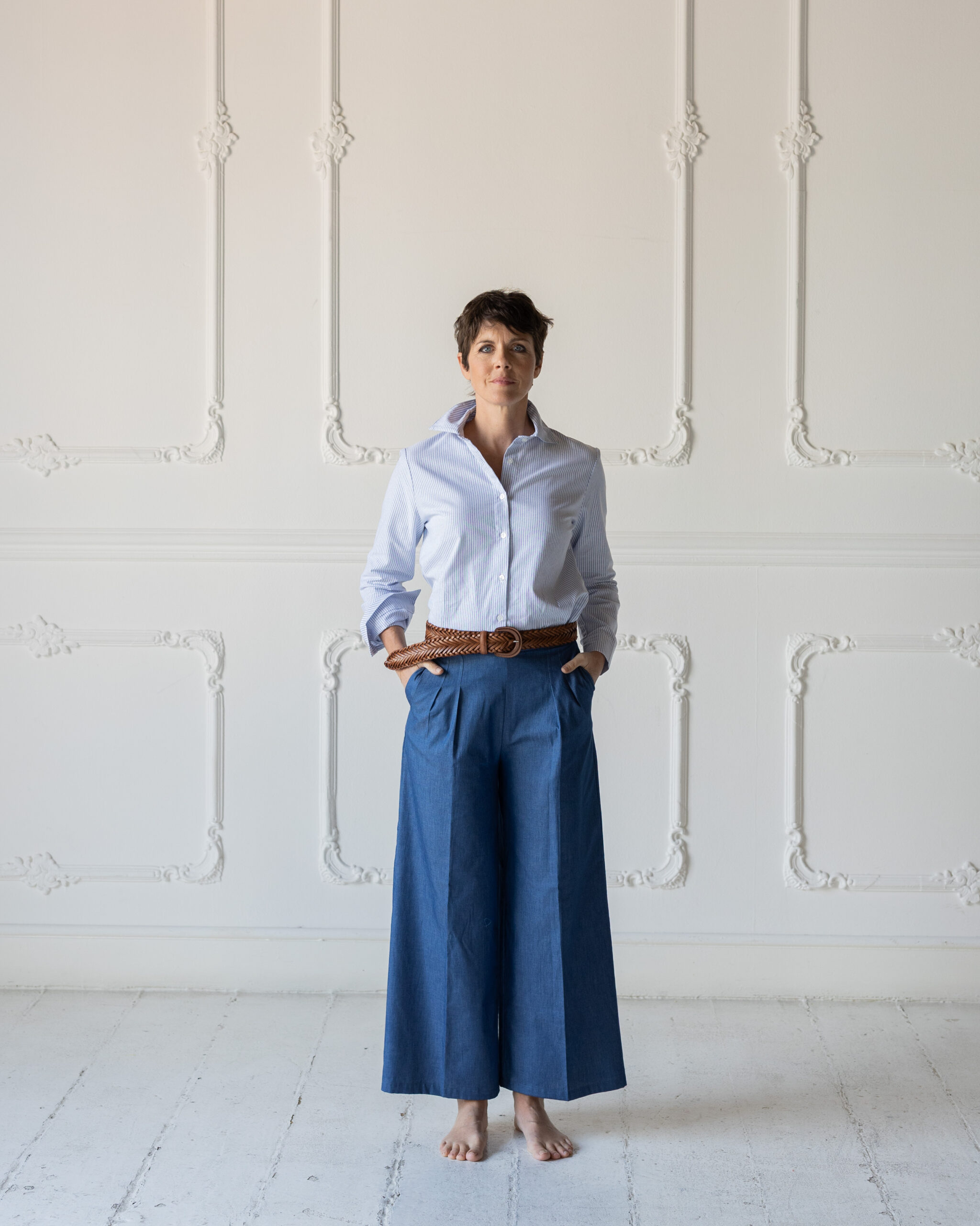 Un pantalone dalla forma super comoda: elastico posteriore, gamba dritta e morbida, pinces fissate in cima per non fare difetto “pancetta” ma che si aprono poi per dare movimento al capo.
