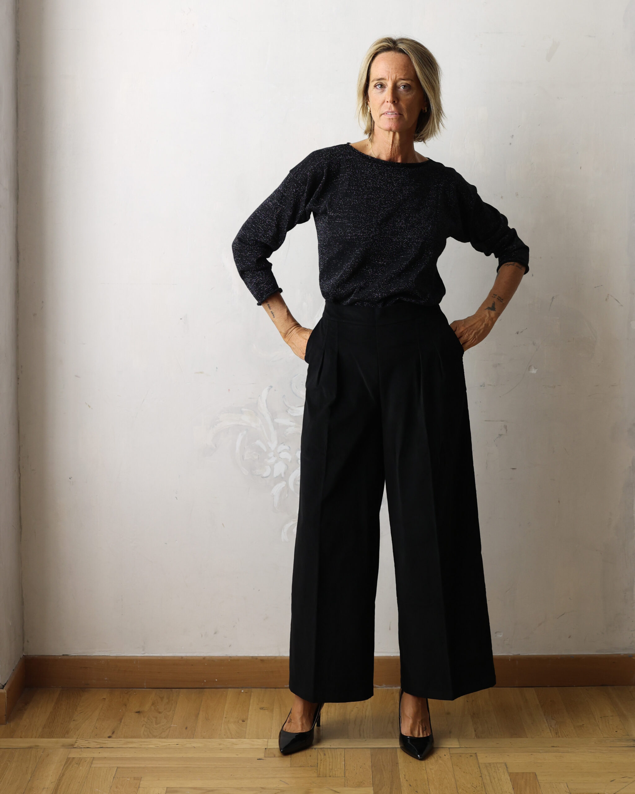 Un pantalone dalla forma super comoda: elastico posteriore, gamba dritta e morbida, pinces fissate in cima per non fare difetto “pancetta” ma che si aprono poi per dare movimento al capo. Cerniera laterale per aiutare la vestibilità che risulta comoda. Tessuto: velluto di cotone liscio