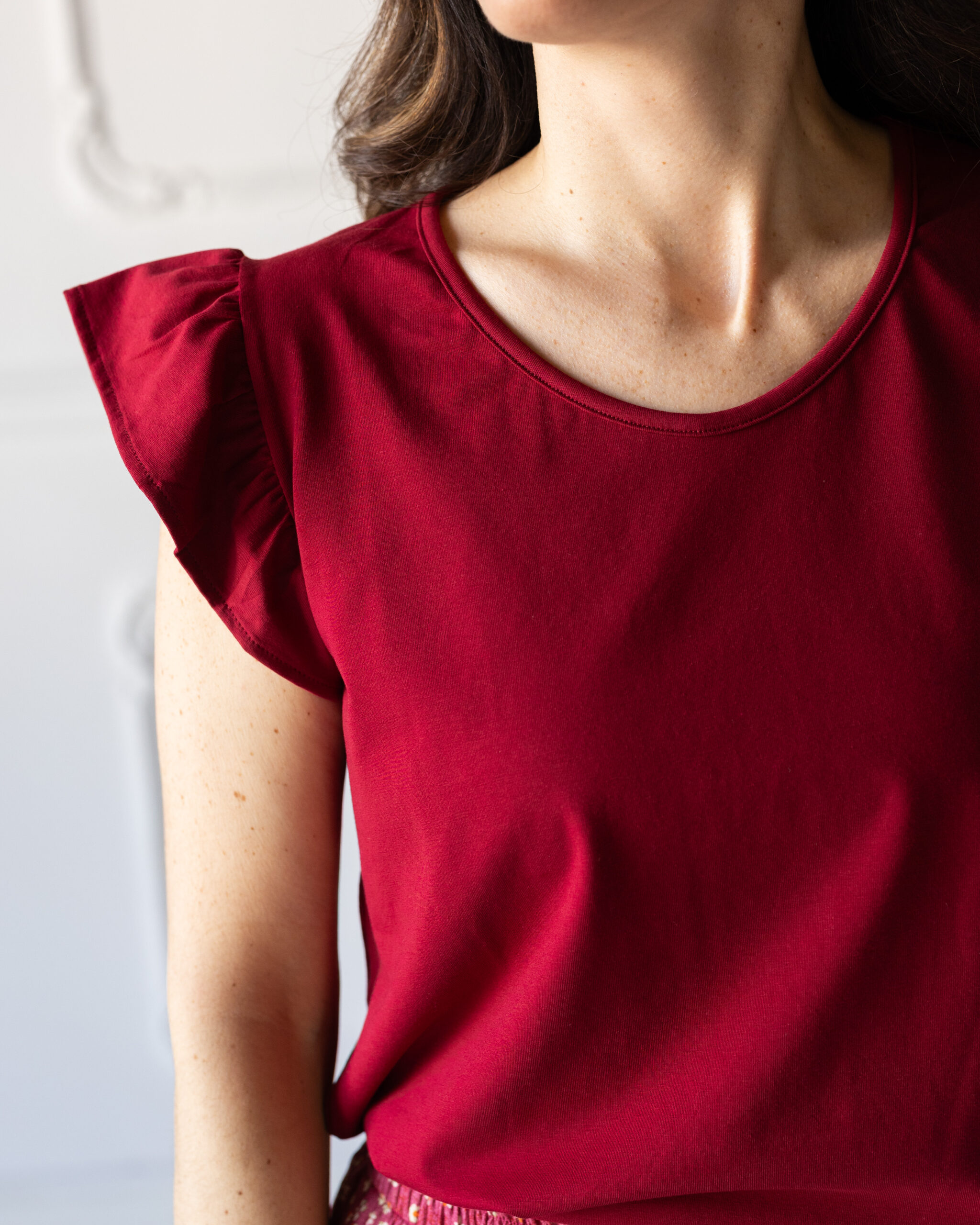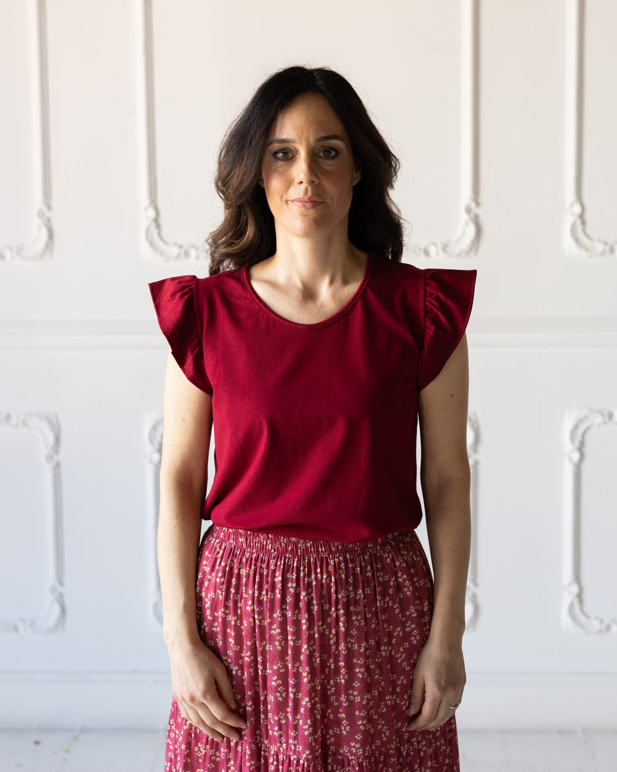 Una t-shirt super femminile grazie allo scollo a U e alle maniche con volant. Super comoda e versatile. Veste comoda! Se siete “petite” potete optare per il modello Amelia da bimba