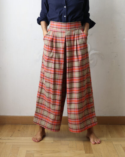 Amo molto le gonne pantalone perché sono versatili: perfette per ufficio e tempo libero ma anche per serate con gli amici. La fascia in vita è fissa davanti ma dietro ha un elastico arricciato molto comodo. Gamba ampia che regala un bellissimo movimento. Perfette con mocassini, sneakers e tacchi alti. Vestibilità: giusta e comoda su fianchi e gambe. Tessuto: flanella di cotone peso medio/pesante. Una nota sui quadri: sono volutamente non appaiati. Questo perché renderli perfettamente simmetrici significherebbe un grande spreco di tessuto e una manodopera maggiore cha farebbe notevolmente aumentare il costo finale