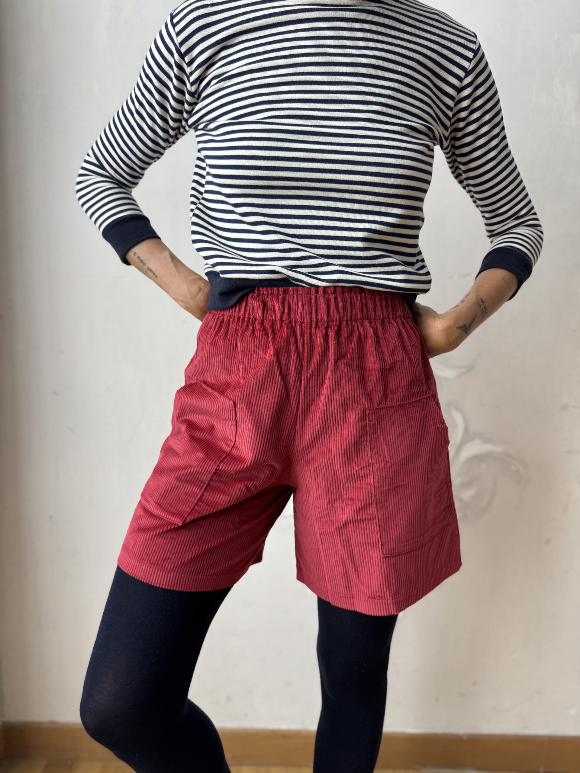 Bermuda donna, elsatico in vita con arricciatura, forma leggermete a trapezio. Attenzione VESTE POCO. Le taglie non corrispondono a quelle di crop o Alfredo, sono mezza taglia in meno.