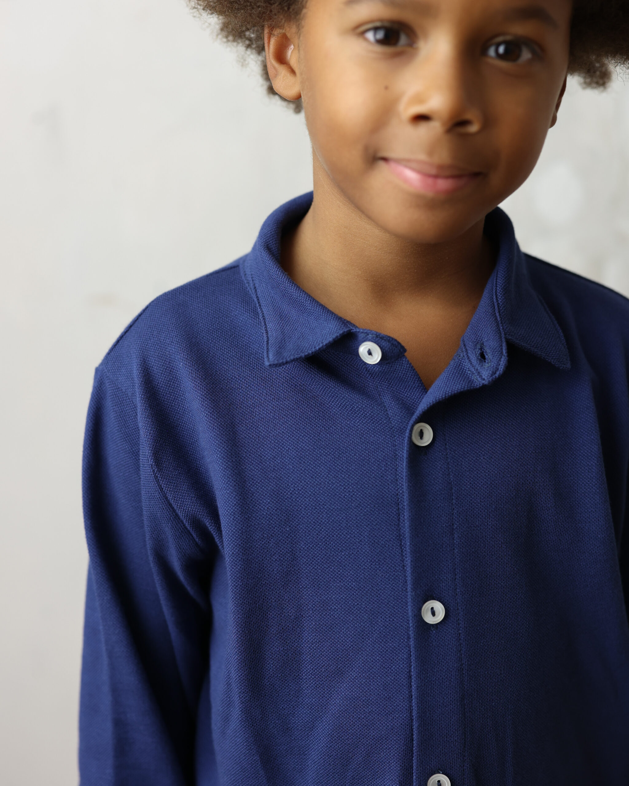 Camicia unisex in cotone piquet blu, molto morbido. La praticità di una polo si unisce alla bellezza della camicia. Per un back to school perfetto.