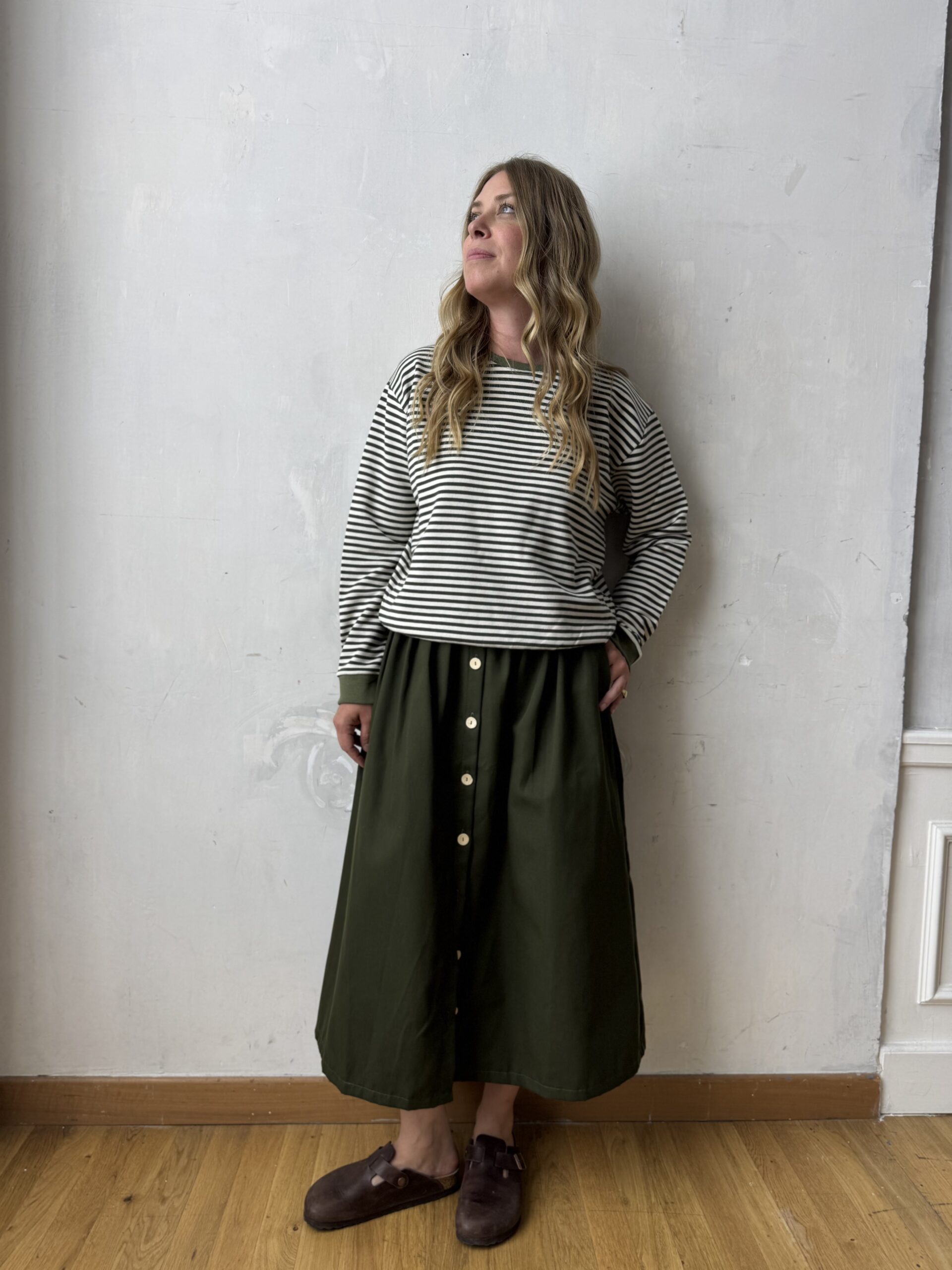Pratica e comoda, modello midi che arriva appena sopra alla caviglia, da usare tutti i giorni ma anche in serate speciali Con comodo elastico in vita per adattarsi a qualsiasi fisicità.