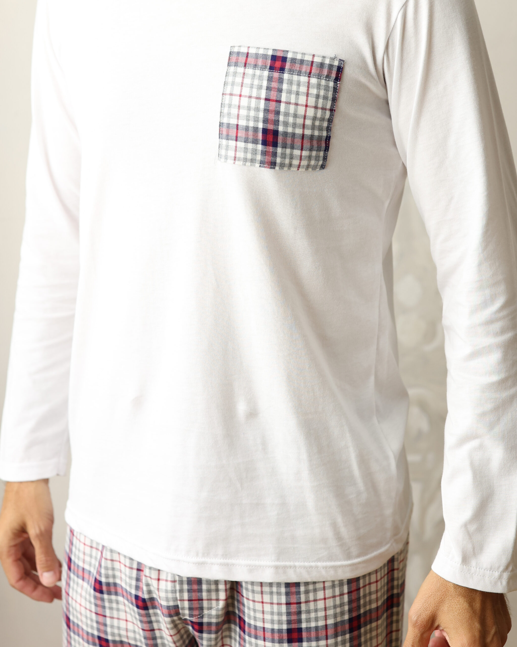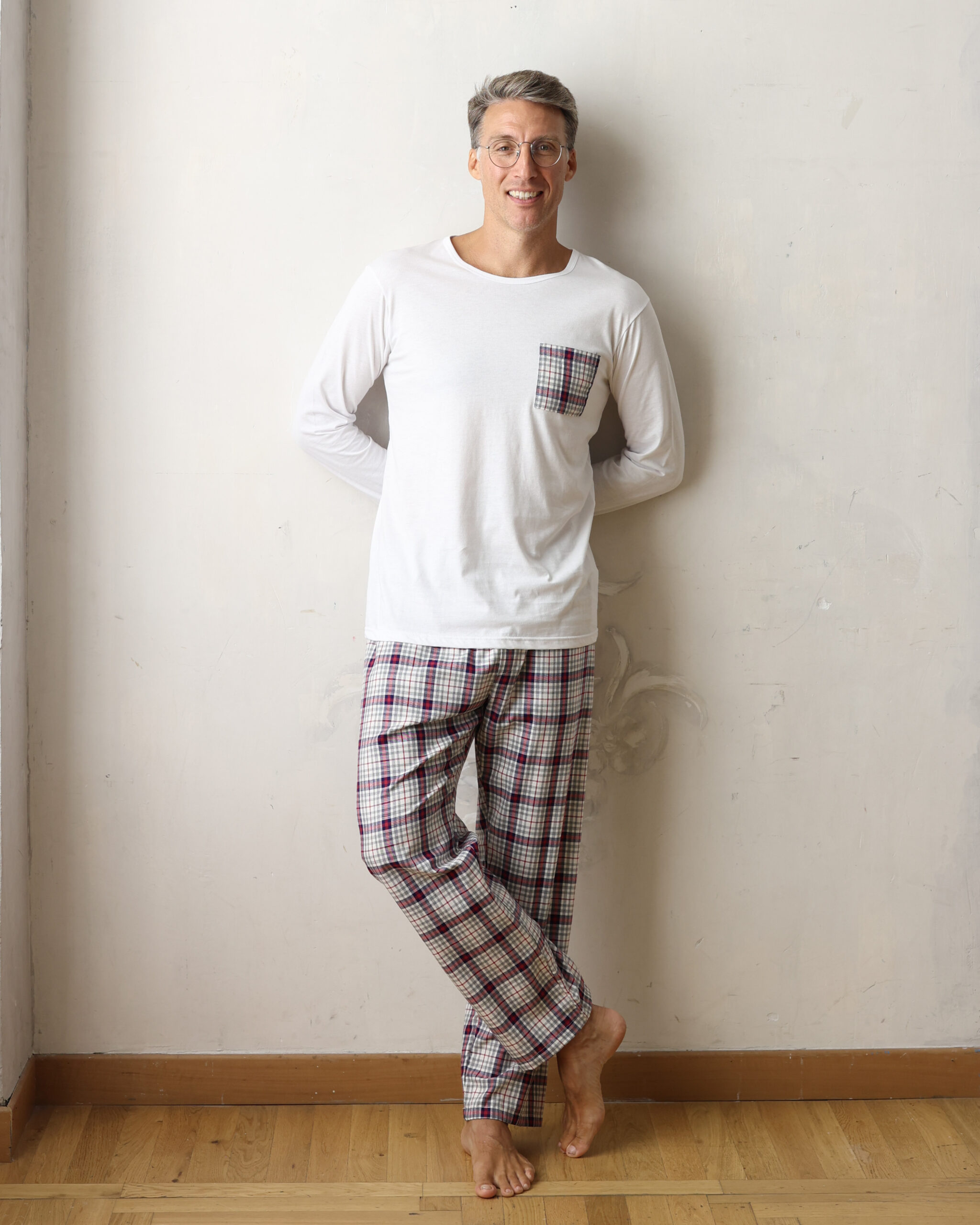 Pigiama con maglietta in jersey di cotone peso medio-leggero, taschino abbinato al pantalone. Una nota sui quadri: sono volutamente non appaiati. Questo perché renderli perfettamente simmetrichi significherebbe un grande spreco di tessuto e una manodopera maggiore cha farebbe notevolmente aumentare il costo finale